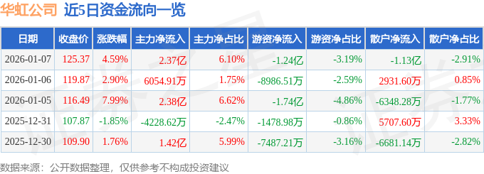 证券之星消息,截至2026年1月7日收盘,华虹公司(688347)报收于125.37元,上涨4.59%,换手率7.74%,成交量31.58万手,成交额38.77亿元。
