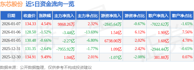 证券之星消息,截至2026年1月7日收盘,东芯股份(688110)报收于134.33元,上涨4.54%,换手率7.23%,成交量31.97万手,成交额42.51亿元。