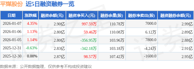 平煤股份融资融券信息显示,融资方面,当日融资买入4265.83万元,融资偿还3268.24万元,融资净买入997.59万元。融券方面,融券卖出4.14万股,融券偿还3.44万股,融券余量110.78万股,融券余额930.55万元。融资融券余额2.99亿元。