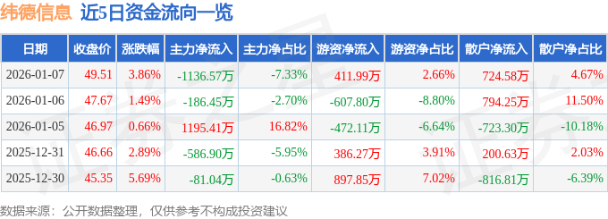 证券之星消息,截至2026年1月7日收盘,纬德信息(688171)报收于49.51元,上涨3.86%,换手率3.72%,成交量3.12万手,成交额1.55亿元。
