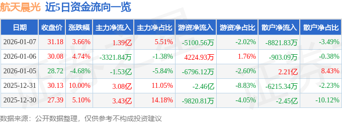 证券之星消息,截至2026年1月7日收盘,航天晨光(600501)报收于31.18元,上涨3.66%,换手率19.01%,成交量81.32万手,成交额25.25亿元。