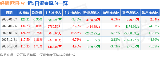 证券之星消息,截至2026年1月7日收盘,经纬恒润(688326)报收于126.31元,下跌5.9%,换手率4.34%,成交量4.85万手,成交额6.17亿元。