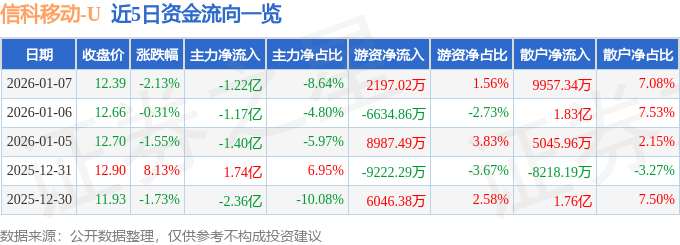 1月7日的资金流向数据方面,主力资金净流出1.22亿元,占总成交额8.64%,游资资金净流入2197.02万元,占总成交额1.56%,散户资金净流入9957.34万元,占总成交额7.08%。