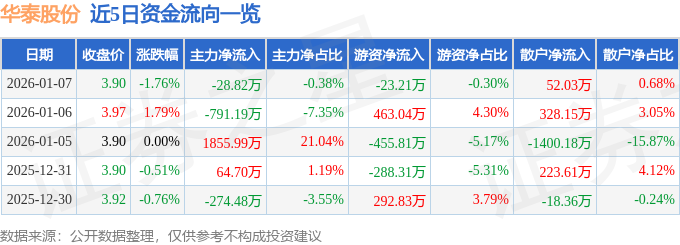 证券之星消息,截至2026年1月7日收盘,华泰股份(600308)报收于3.9元,下跌1.76%,换手率1.28%,成交量19.43万手,成交额7620.06万元。