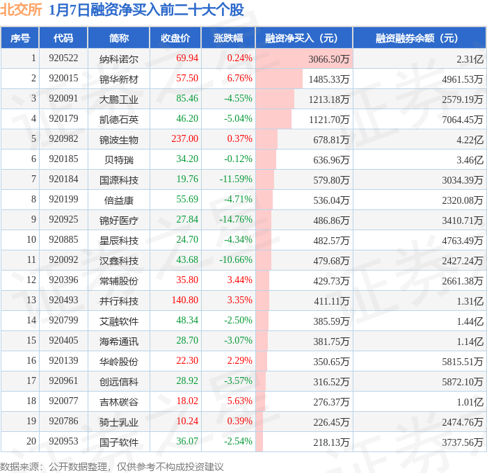 北交所融资净买入前三分别为:纳科诺尔(920522)融资净买入3066.5万元、锦华新材(920015)融资净买入1485.33万元、大鹏工业(920091)融资净买入1213.18万元,前20具体见下表: