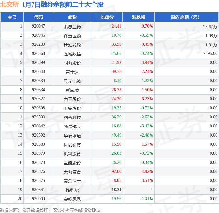 北交所融券余额前三分别为:诺思兰德(920047)融券余额28.67万元、森萱医药(920946)融券余额1.08万元、长虹能源(920239)融券余额1.01万元,前20具体见下表: