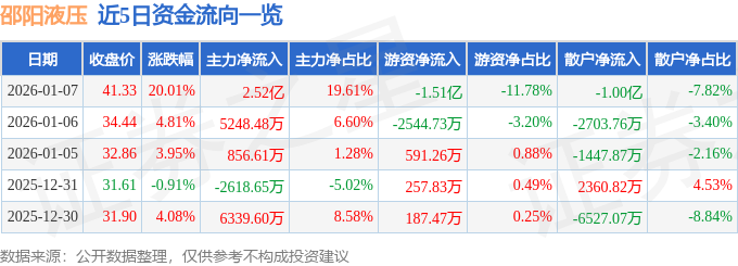 证券之星消息,截至2026年1月7日收盘,邵阳液压(301079)报收于41.33元,上涨20.01%,涨停,换手率48.99%,成交量34.06万手,成交额12.84亿元。