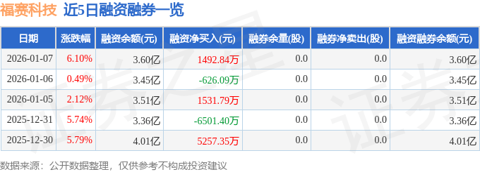 福赛科技融资融券信息显示,融资方面,当日融资买入8162.74万元,融资偿还6669.89万元,融资净买入1492.84万元。融券方面,融券卖出0.0股,融券偿还0.0股,融券余量0.0股,融券余额0.0万元。融资融券余额3.6亿元。