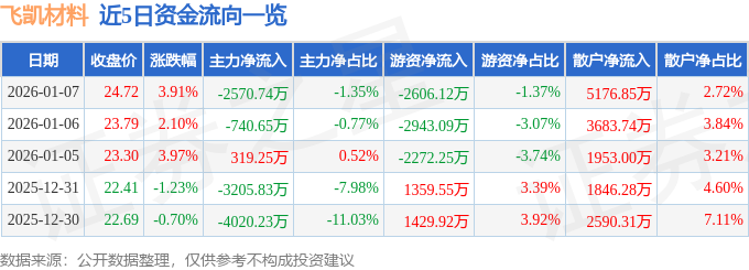 证券之星消息,截至2026年1月7日收盘,飞凯材料(300398)报收于24.72元,上涨3.91%,换手率13.61%,成交量76.75万手,成交额19.06亿元。
