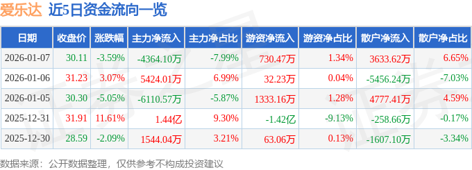 证券之星消息,截至2026年1月7日收盘,爱乐达(300696)报收于30.11元,下跌3.59%,换手率6.81%,成交量18.1万手,成交额5.46亿元。
