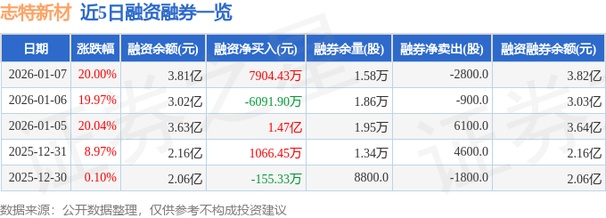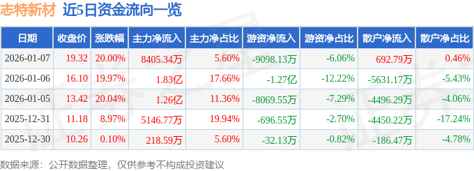 证券之星消息,截至2026年1月7日收盘,志特新材(300986)报收于19.32元,上涨20.0%,已连续涨停3天,换手率19.9%,成交量81.9万手,成交额15.01亿元。