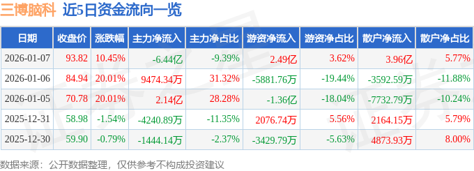 证券之星消息,截至2026年1月7日收盘,三博脑科(301293)报收于93.82元,上涨10.45%,换手率46.31%,成交量74.53万手,成交额68.62亿元。