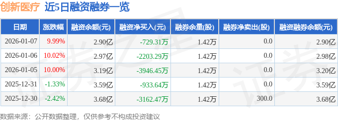 证券之星消息,截至2026年1月7日收盘,创新医疗(002173)报收于28.63元,上涨9.99%,已连续涨停3天,换手率2.44%,成交量10.16万手,成交额2.91亿元。