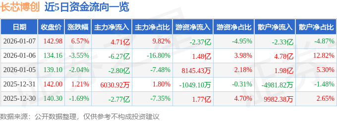 1月7日的资金流向数据方面,主力资金净流入4.71亿元,占总成交额9.82%,游资资金净流出2.37亿元,占总成交额4.95%,散户资金净流出2.33亿元,占总成交额4.87%。