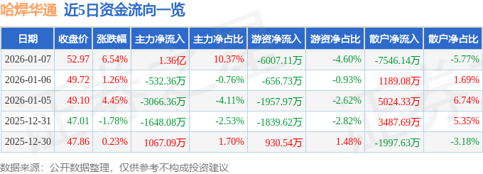 证券之星消息,截至2026年1月7日收盘,哈焊华通(301137)报收于52.97元,上涨6.54%,换手率13.6%,成交量24.73万手,成交额13.07亿元。