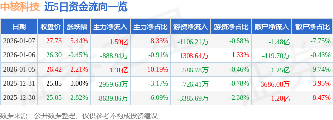 证券之星消息,截至2026年1月7日收盘,中核科技(000777)报收于27.73元,上涨5.44%,换手率18.08%,成交量69.31万手,成交额19.1亿元。