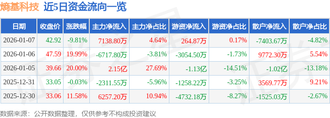 证券之星消息,截至2026年1月7日收盘,熵基科技(301330)报收于42.92元,下跌9.81%,换手率31.26%,成交量35.61万手,成交额15.37亿元。