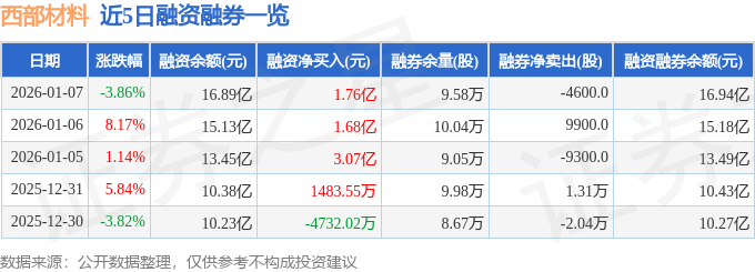 西部材料融资融券信息显示,融资方面,当日融资买入7.96亿元,融资偿还6.2亿元,融资净买入1.76亿元,连续3日净买入累计6.51亿元。融券方面,融券卖出500.0股,融券偿还5100.0股,融券余量9.58万股,融券余额458.59万元。融资融券余额16.94亿元。