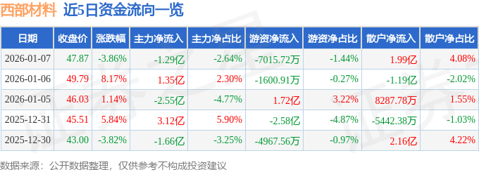 证券之星消息,截至2026年1月7日收盘,西部材料(002149)报收于47.87元,下跌3.86%,换手率20.96%,成交量102.3万手,成交额48.78亿元。
