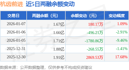 证券之星消息,1月7日,杭齿前进(601177)融资买入996.53万元,融资偿还816.36万元,融资净买入180.18万元,融资余额1.67亿元。