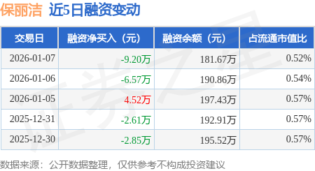 证券之星消息,1月7日,保丽洁(920802)融资买入33.07万元,融资偿还42.26万元,融资净卖出9.2万元,融资余额181.67万元。