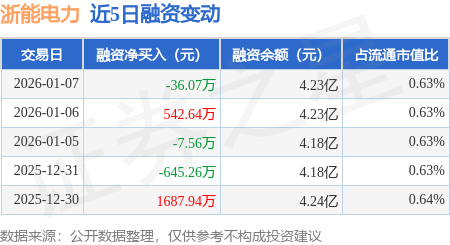 证券之星消息,1月7日,浙能电力(600023)融资买入3023.98万元,融资偿还3060.06万元,融资净卖出36.07万元,融资余额4.23亿元。