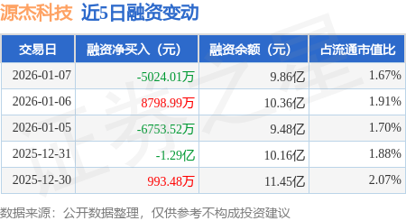 证券之星消息,1月7日,源杰科技(688498)融资买入2.86亿元,融资偿还3.37亿元,融资净卖出5024.01万元,融资余额9.86亿元,近20个交易日中有12个交易日出现融资净买入。