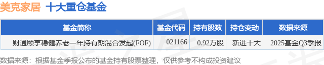 根据2025基金Q3季报公募基金重仓股数据,重仓该股的公募基金共1家,其中持有数量最多的公募基金为财通基金的财通颐享稳健养老一年持有期混合发起(FOF)。财通颐享稳健养老一年持有期混合发起(FOF)目前规模为0.95亿元,最新净值1.0938(1月5日),较上一交易日上涨0.15%,近一年上涨6.38%。该公募基金现任基金经理为陈曦。陈曦在任的基金产品包括:财通聚福稳健3个月持有期混合发起(FOF)A,管理时间为2025年6月11日至今,期间收益率为0.96%;财通聚元平衡3个月持有期混合发起(FOF)A,管理时间为2025年9月25日至今,期间收益率为-0.36%;财通泰和多资产一年持有期混合发起(FOF),管理时间为2025年12月2日至今,期间收益率为1.85%。