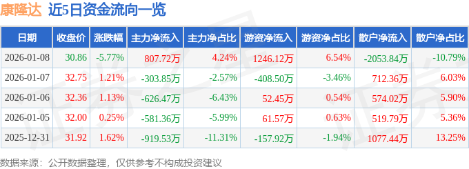 证券之星消息,截至2026年1月8日收盘,康隆达(603665)报收于30.86元,下跌5.77%,换手率3.78%,成交量6.05万手,成交额1.9亿元。