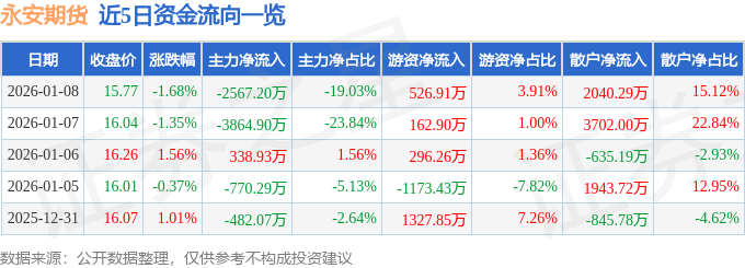 证券之星消息,截至2026年1月8日收盘,永安期货(600927)报收于15.77元,下跌1.68%,换手率0.59%,成交量8.52万手,成交额1.35亿元。