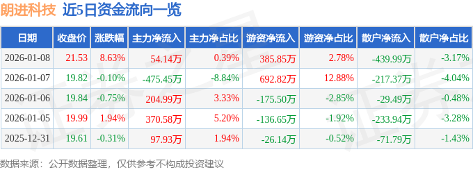证券之星消息,截至2026年1月8日收盘,朗进科技(300594)报收于21.53元,上涨8.63%,换手率7.24%,成交量6.59万手,成交额1.39亿元。