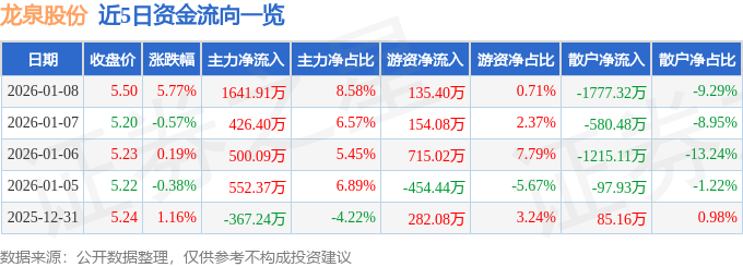 证券之星消息,截至2026年1月8日收盘,龙泉股份(002671)报收于5.5元,上涨5.77%,换手率6.41%,成交量35.3万手,成交额1.91亿元。