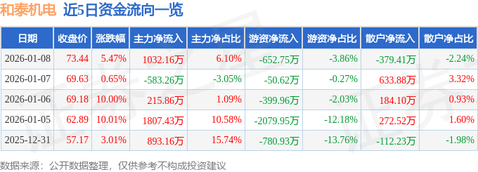 证券之星消息,截至2026年1月8日收盘,和泰机电(001225)报收于73.44元,上涨5.47%,换手率10.99%,成交量2.31万手,成交额1.69亿元。
