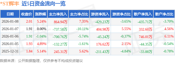 证券之星消息,截至2026年1月8日收盘,*ST辉丰(002496)报收于2.01元,上涨5.24%,换手率5.45%,成交量60.62万手,成交额1.18亿元。