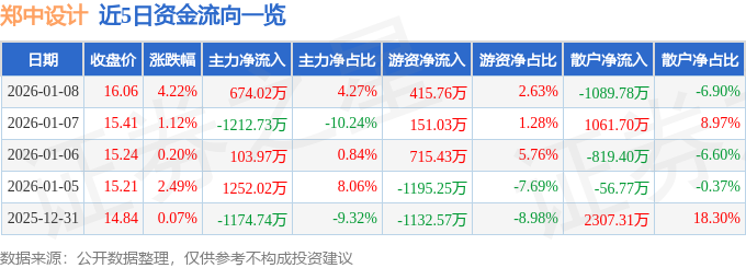 证券之星消息,截至2026年1月8日收盘,郑中设计(002811)报收于16.06元,上涨4.22%,换手率3.49%,成交量9.89万手,成交额1.58亿元。