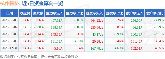 证券之星消息,截至2026年1月8日收盘,杭州园林(300649)报收于14.69元,上涨3.96%,换手率5.2%,成交量5.52万手,成交额8037.57万元。