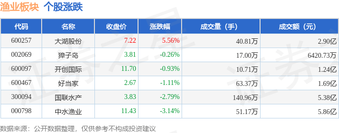 证券之星消息,1月8日渔业板块较上一交易日下跌0.71%,中水渔业领跌。当日上证指数报收于4082.98,下跌0.07%。深证成指报收于13959.48,下跌0.51%。渔业板块个股涨跌见下表: