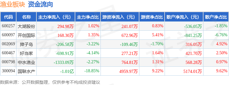 从资金流向上来看,当日渔业板块主力资金净流出1.19亿元,游资资金净流入6806.54万元,散户资金净流入5102.74万元。渔业板块个股资金流向见下表: