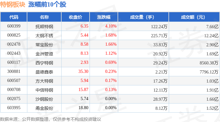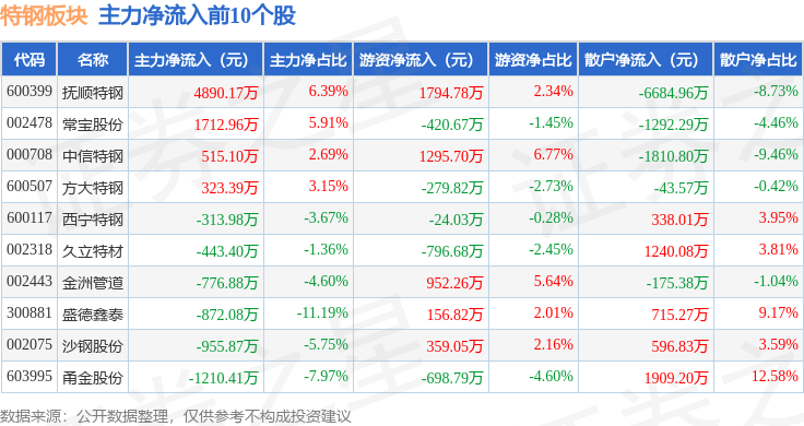 从资金流向上来看,当日特钢板块主力资金净流出4912.75万元,游资资金净流出1324.36万元,散户资金净流入6237.11万元。特钢板块个股资金流向见下表:
