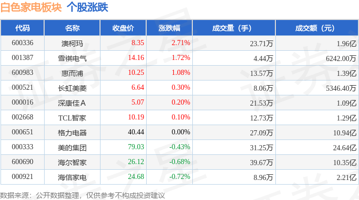 证券之星消息,1月8日白色家电板块较上一交易日下跌0.33%,海信家电领跌。当日上证指数报收于4082.98,下跌0.07%。深证成指报收于13959.48,下跌0.51%。白色家电板块个股涨跌见下表: