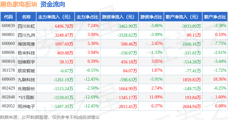 从资金流向上来看,当日黑色家电板块主力资金净流入1551.49万元,游资资金净流出676.94万元,散户资金净流出874.55万元。黑色家电板块个股资金流向见下表: