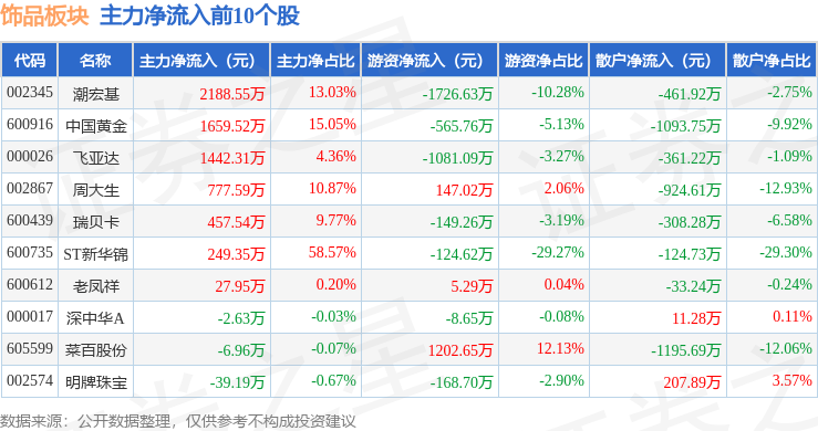 从资金流向上来看,当日饰品板块主力资金净流入4597.94万元,游资资金净流出3647.34万元,散户资金净流出950.6万元。饰品板块个股资金流向见下表: