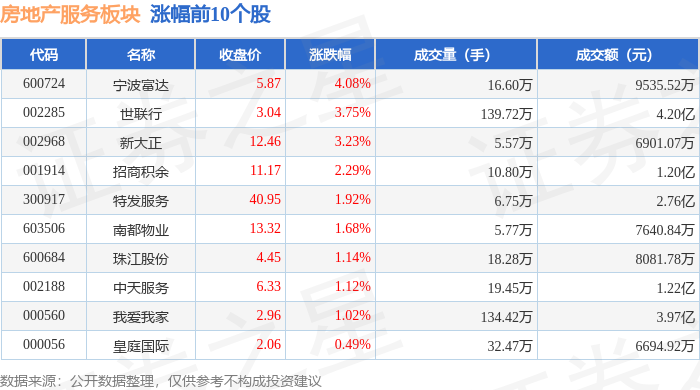 证券之星消息,1月8日房地产服务板块较上一交易日上涨2.22%,宁波富达领涨。当日上证指数报收于4082.98,下跌0.07%。深证成指报收于13959.48,下跌0.51%。房地产服务板块个股涨跌见下表: