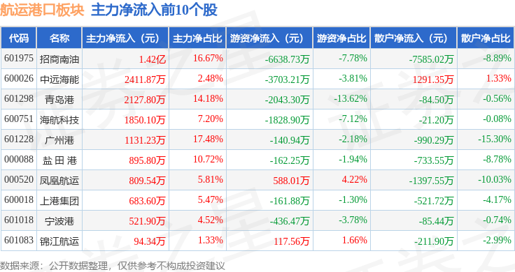 从资金流向上来看,当日航运港口板块主力资金净流出3.09亿元,游资资金净流出3544.58万元,散户资金净流入3.44亿元。航运港口板块个股资金流向见下表: