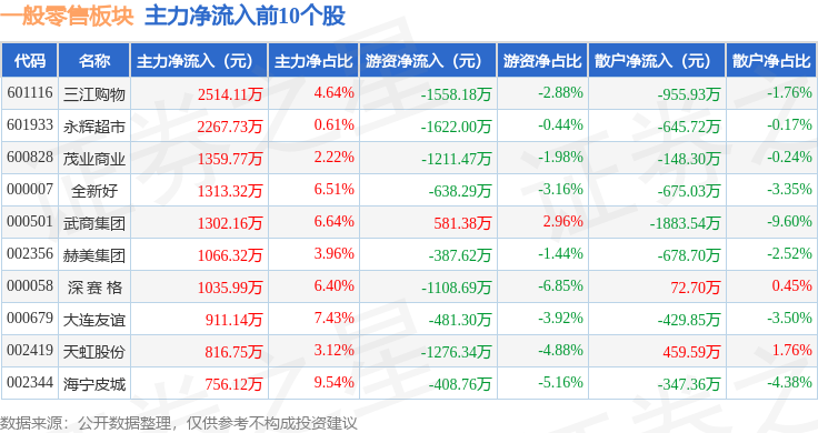从资金流向上来看,当日一般零售板块主力资金净流出8.63亿元,游资资金净流入1.01亿元,散户资金净流入7.62亿元。一般零售板块个股资金流向见下表: