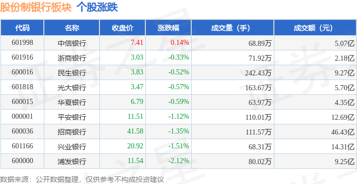 证券之星消息,1月8日股份制银行板块较上一交易日下跌1.16%,浦发银行领跌。当日上证指数报收于4082.98,下跌0.07%。深证成指报收于13959.48,下跌0.51%。股份制银行板块个股涨跌见下表: