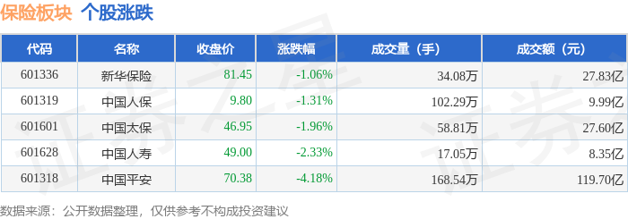 证券之星消息,1月8日保险板块较上一交易日下跌2.61%,中国平安领跌。当日上证指数报收于4082.98,下跌0.07%。深证成指报收于13959.48,下跌0.51%。保险板块个股涨跌见下表: