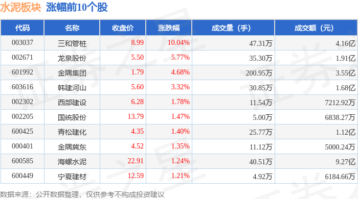 证券之星消息,1月8日水泥板块较上一交易日上涨1.02%,三和管桩领涨。当日上证指数报收于4082.98,下跌0.07%。深证成指报收于13959.48,下跌0.51%。水泥板块个股涨跌见下表:
