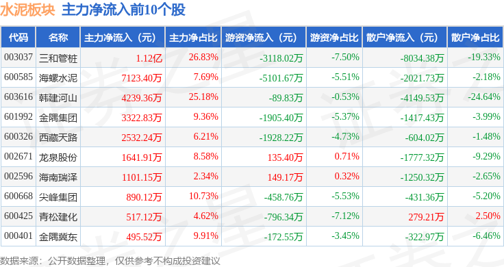 从资金流向上来看,当日水泥板块主力资金净流入2.08亿元,游资资金净流出1.62亿元,散户资金净流出4583.81万元。水泥板块个股资金流向见下表: