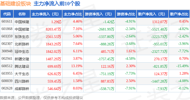 从资金流向上来看,当日基础建设板块主力资金净流入1665.35万元,游资资金净流出2.26亿元,散户资金净流入2.1亿元。基础建设板块个股资金流向见下表:
